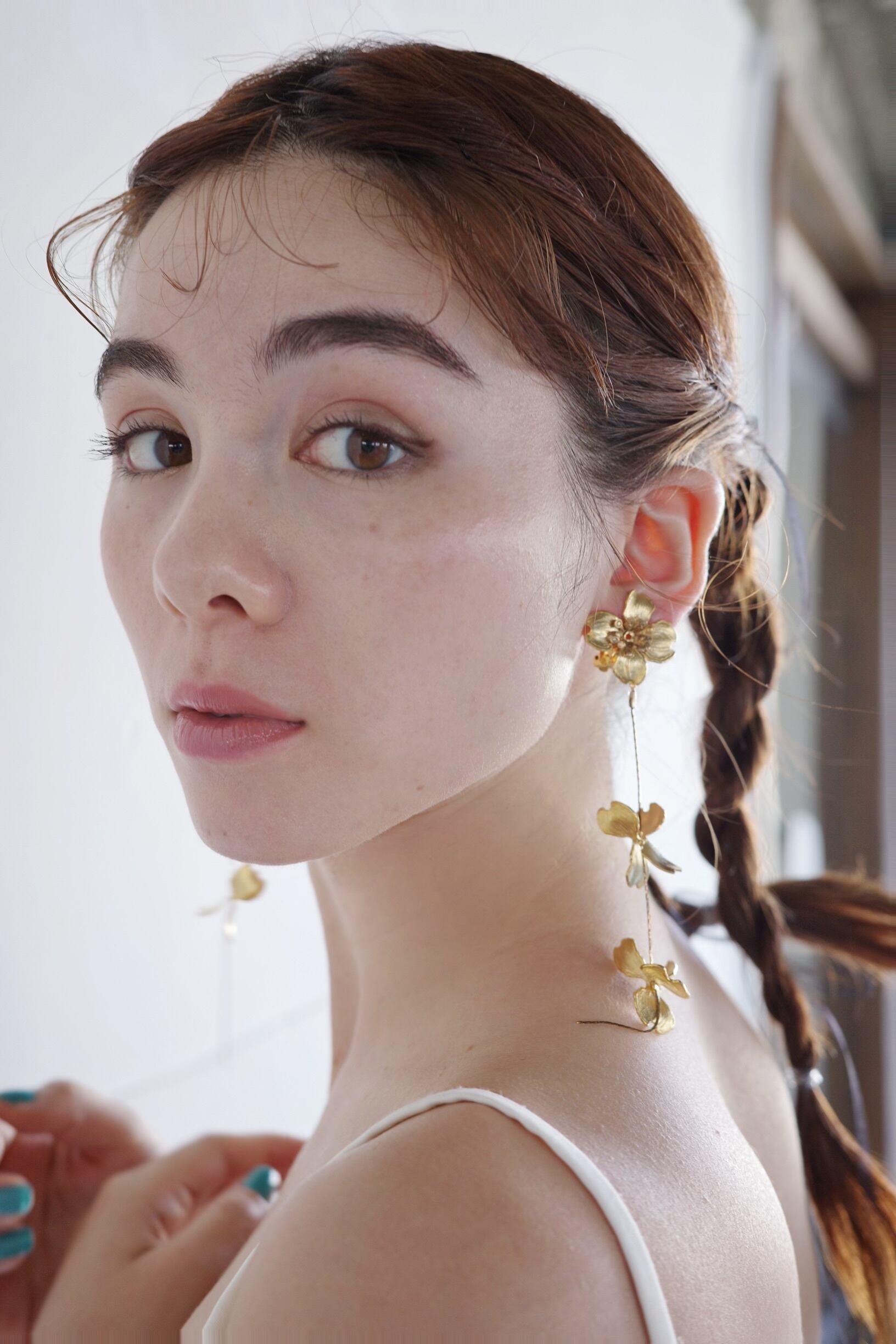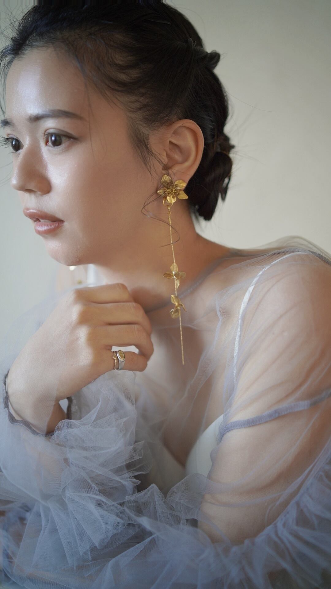 可憐なgoldのフリージアの花をモチーフにした、繊細で上品な耳飾り 「2way Elegant Freesia」。