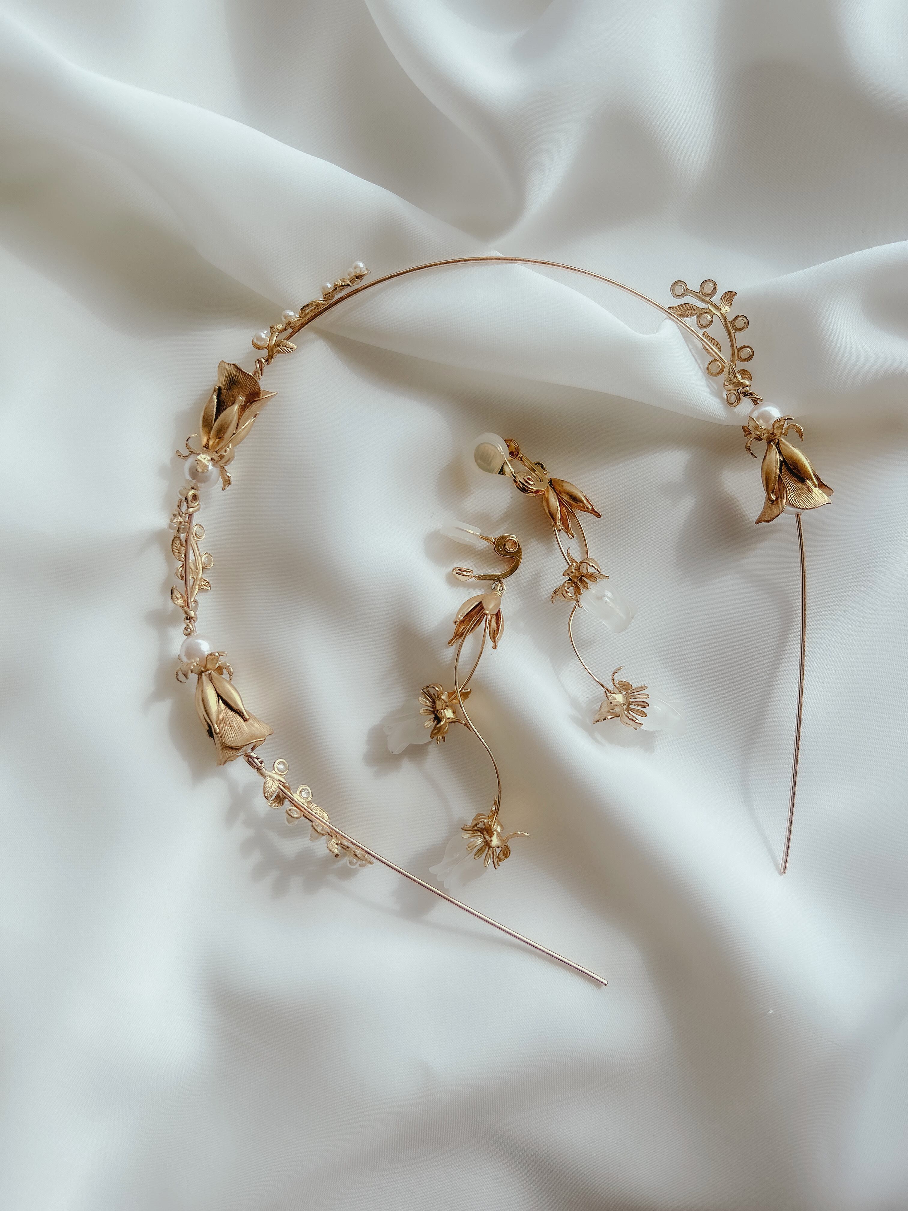 極細のカチューシャラインは、正面から纏うと控えめな輝きが横顔を引き立て、後ろにつけると花々が連なって咲くようなロマンティックなシルエットに。