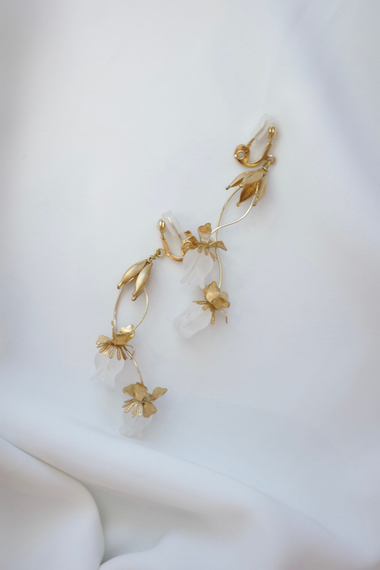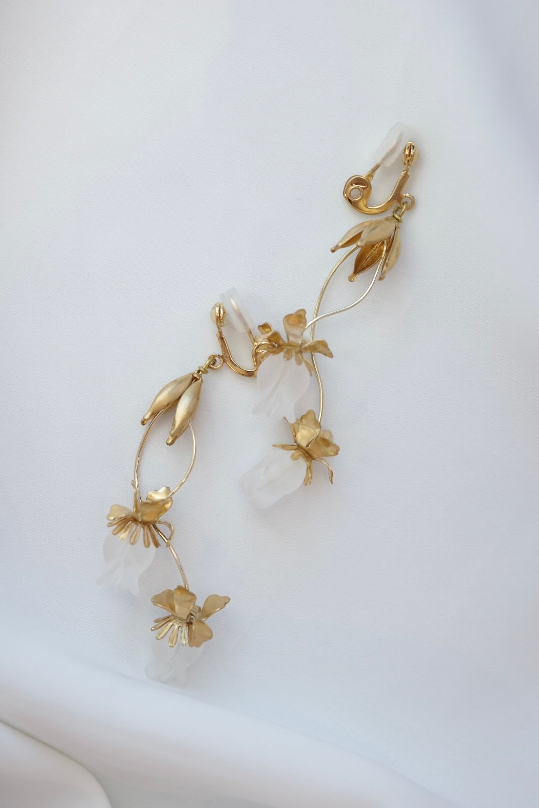 冬の朝、ひっそりと咲くチューリップに霜が降りたような、透け感と温度を両方抱えた耳飾り。
